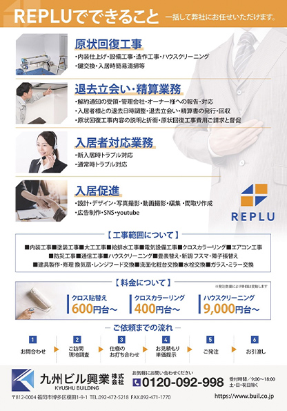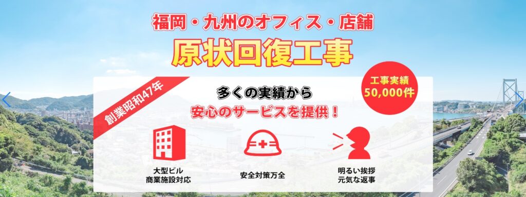 事業用不動産(アパート・マンション・オフィス・店舗・倉庫等)の原状回復工事から定期点検・メンテナンス工事や単体リフォーム工事を行っております。